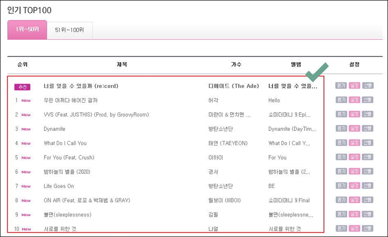 lg 유플러스 사이트에서 제공하는 인기 TOP 100 목록을 살펴볼게요. 최근 인기 있는 음원 1위부터 100위까지 나와 있는데요. 리스트 상에서 "듣기" 버튼을 클릭하면 해당 음원을 들어볼 수 있어요. "설정" 버튼을 클릭하면 본인이 사용하는 폰에 컬러링 설정을 할 수 있고, "선물"을 클릭하면 남에게 선물로 컬러링 컨텐츠를 보낼 수 있어요.