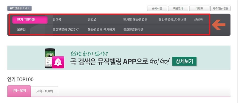 기본적으로 나오는 통화연결음을 대신할 수 있는 인기곡, 최신곡, 장르별 음원, 인사말, 신청곡 등 여러 가지가 나와 있어요. 아무래도 컬러링 특성상 본인이 듣는 경우보다는 남들이 듣는 경우가 많은데요. 그렇기 때문에 인기곡 위주로 컬러링 설정을 하는 것을 추천드려요.