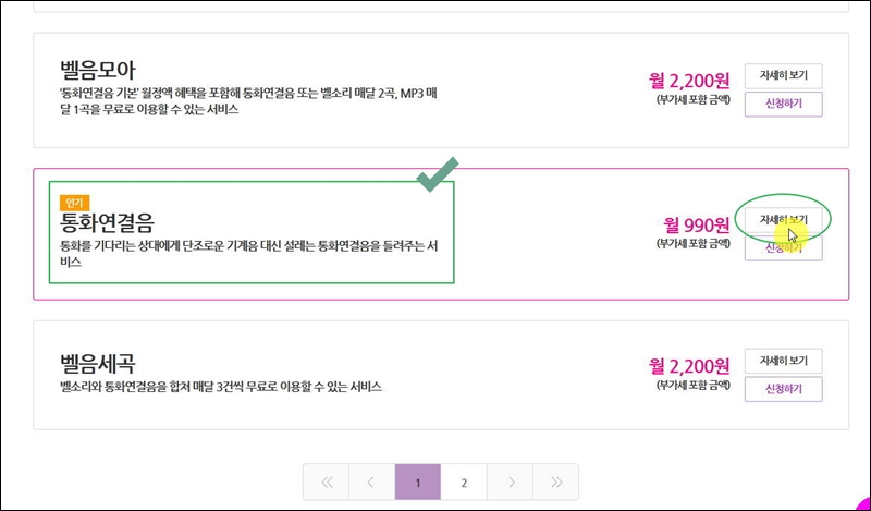 뮤직 페이지에서 쭉 내려가다 보면 "통화연결음"을 찾을 수 있어요. 해당 서비스를 이용하면 lg의 컬러링 서비스를 이용할 수 있어요. 비용은 부가세 포함 월 990원으로 저렴한 편이고요. "자세히 보기" 버튼을 누르면 설정을 하거나 음원을 살펴볼 수 있어요.