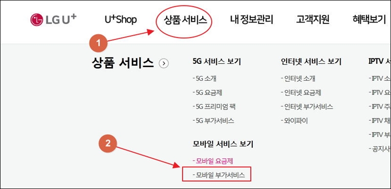 lg 유플러스 사이트에 접속했어요. 일단 컬러링 설정을 하기 위해 메뉴를 선택해야 하는데요. 메뉴에서 "상품 서비스"를 클릭한 후 "모바일 서비스 보기" 카테고리에 있는 모바일 부가 서비스를 클릭해 주세요.