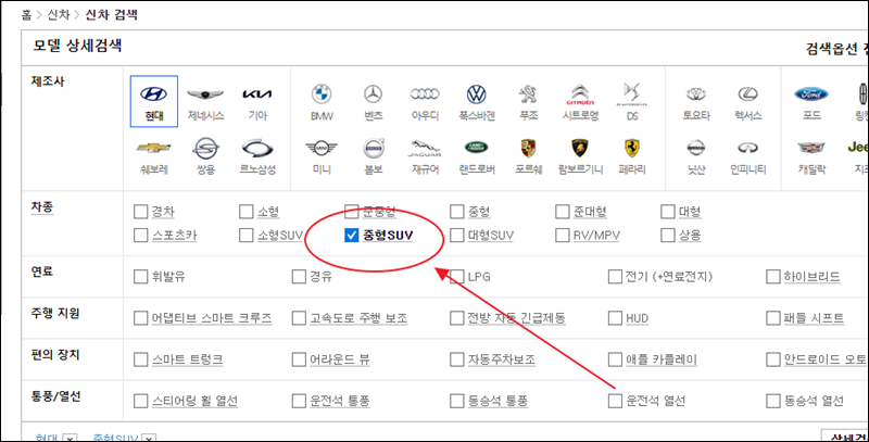 어떤 모델을 구매할 지 모르는 분들을 위하여 모델 상세검색 기능이 마련되어 있는데요. 우리는 싼타페에 대한 가격표를 알아볼 것이므로 차종에서 중형 SUV를 선택하면 됩니다.