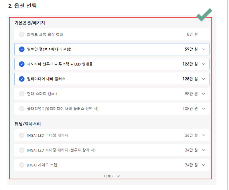 이번에는 현대자동차의 옵션을 선택할 차례인데요. 가격표와 옵션명을 참고하여 선택해 주세요.