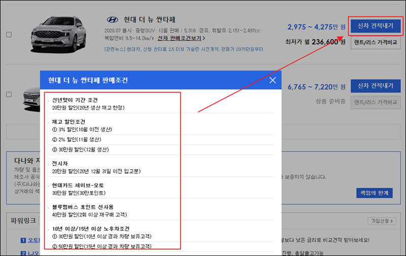 신년맞이 기간 조건, 재고 할인조건, 전시차, 현대카드 세이브 등 싼타페를 구매할 때 정해진 가격표보다 더 저렴하게 살 수 있도록 도와주는 현대자동차의 판매조건을 살펴보면 좋습니다. 본인에게 해당하는 것을 꼼꼼히 살펴본 후 리스트에 있는 "신차 견적내기"를 클릭해 주세요.