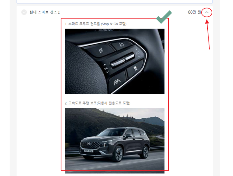 옵션명만 보고는 어떤 기능을 하는지 알 수 없는 경우에는 가격표 옆에 있는 화살표를 클릭해 보세요. 사진과 설명을 통해 어떤 기능을 하는지 알 수 있습니다.