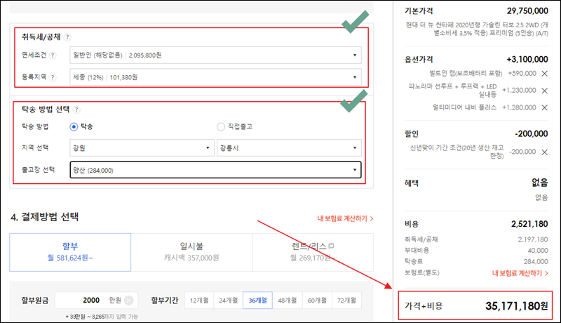 마지막으로 신차 구매 시 발생하게 되는 탁송료, 취득세, 공채에 관한 내용을 입력해 주세요. 그럼 우측에 있는 가격표를 통해 현대자동차 싼타페 구매 시 내야 하는 최종 비용을 확인할 수 있습니다. 이렇게 구한 금액과 실제 구입 비용 사이에 거의 차이가 없을 거에요. 대리점에서 자체적으로 혜택을 제공하거나 카드로 결제시 할인 금액 정도 차이가 날 것이라고 생각됩니다.