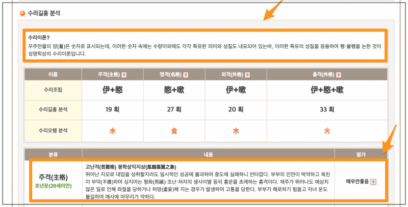 한자이름에 대하여 음양조화와 오행의 상생삭극을 분석한 결과도 확인이 가능한데요. 각 한자의 획수와 음양을 가지고 분석해줘요. 상세하게 적힌 이름풀이 내용도 있으니 참고해 주세요.