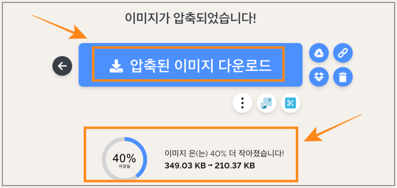 순식간에 용량 줄이기가 완료 되었는데요. 압축 기능을 통해 용량이 40% 더 작어졌어요. 구체적으로 확인해보니 349.03KB에서 210.37KB로 줄어든 것이 딱 보이네요.