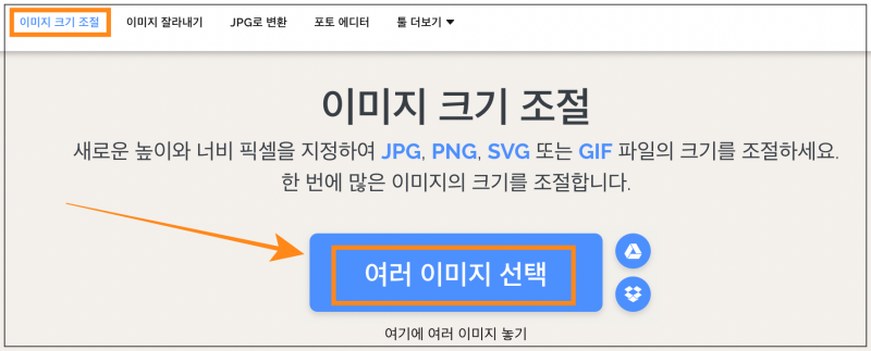 이번에는 이미지의 높이와 너비 조절을 통해 파일의 크기 줄이기를 해볼게요. 큰 화면으로 열어볼 것이 아니라면 해당 기능을 사용해보세요. 크기 조절을 통해 용량 줄이기 효과도 낼 수 있어요. 여기에서는 JPG, PNG, GIF와 더불어 SVG 파일에 대해서도 크기 조절이 가능해요.
