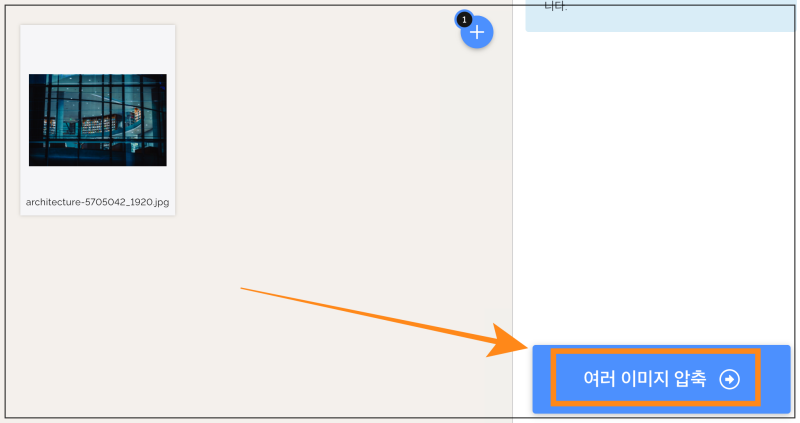 저는 그냥 하나만 선택했는데요. 이미지 파일을 추가하면 화면에 해당 파일이 나타나요. 이상태에서 우측에 있는 "여러 이미지 압축" 버튼을 클릭하면 용량 줄이기 서비스가 실행돼요.