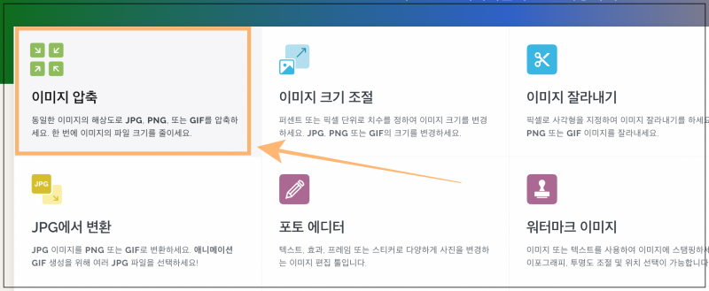 이곳에서는 여러 가지 이미지 관련 서비스를 제공하고 있는데요. 이미지 파일에 대한 압축, 크기 조절, 잘라내기, JPG에서 변환, 포토 에디터, 워터마크 넣기 등 다양해요. 여기에서 용량 줄이기를 하고 싶다면 "이미지 압축" 기능을 선택하면 돼요. 한 번에 파일 크기를 많이 줄일 수 있어요.