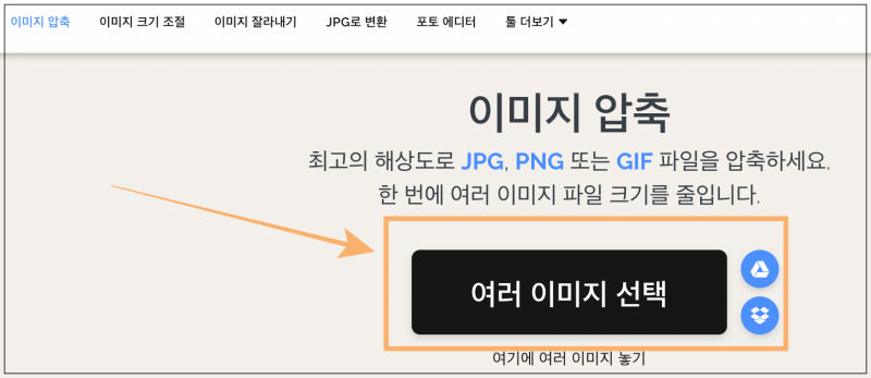 이미지 압축 기능을 클릭하면 해당 기능을 사용할 수 있는 페이지로 이동하게 되는데요. JPG, PNG, GIF 파일 모두 가능해요. 최고의 해상도를 유지하면서 용량 줄이기를 할 수 있기 때문에 화질 걱정은 하지 않으셔도 돼요. 한 번에 여러 개의 파일에 대한 용량 축소도 가능하오니 여러 개를 선택해 보세요.