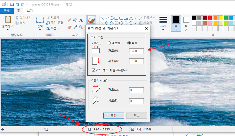 이번에는 픽셀 단위로 사진의 크기 줄이기를 해보도록 하겠습니다. 본인이 원하는 수치를 픽셀 단위로 입력하면 됩니다. 그림판 하단에 있는 사진 파일의 사이즈를 참고하여 줄여주세요.