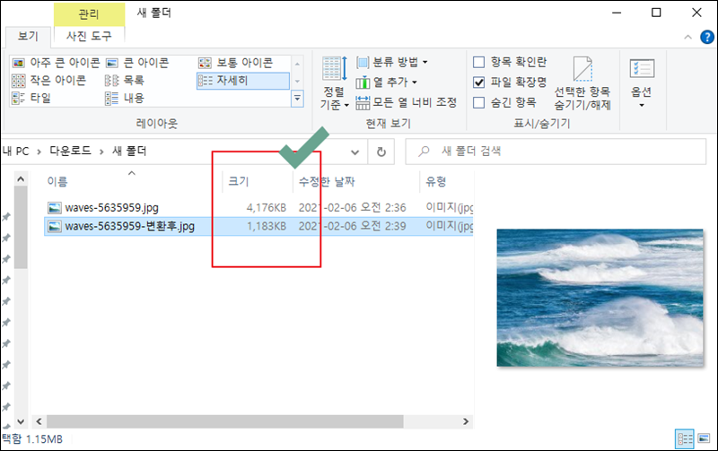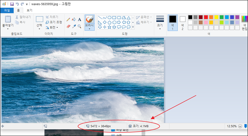 그림판을 이용하여 용량을 줄인 파일을 확인해 보도록 하겠습니다. 앞서 언급한 바와 같이 사진 파일의 용량이 1/4 정도 줄어든 것을 확인할 수 있습니다.