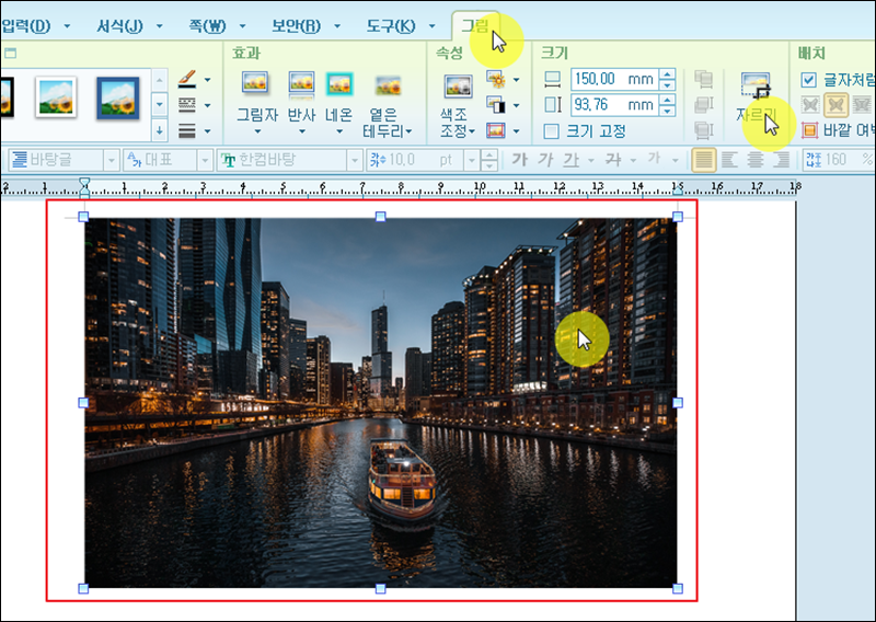 아래아 한글 프로그램을 실행한 후 작업을 진행할 사진을 문서에 추가합니다. 2가지 단계를 통해 사진의 용량을 줄이려고 하는데요. 메뉴에서 "그림"을 클릭한 후 "자르기" 버튼을 클릭합니다. 사진의 전체 모습을 그대로 유지하면서 용량을 줄이고 싶은 경우에는 "자르기" 단계를 건너뛰어 주세요.
