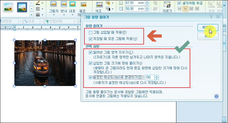 그림 용량 줄이기 설정창이 나타났습니다. 여기서 가장 먼저 선택 사항을 모두 체크해 주세요. 잘라낸 그림 영역을 지우면 나머지 영역에 대한 부분만 남기 때문에 한글 문서의 용량을 줄일 때 도움이 됩니다. 삽입한 그림 크기에 맞춰 용량을 줄이는 것도 도움이 되고요. 마지막으로 해상도의 경우에는 생각을 좀 해보셔야 되는데요. 한글에 삽입한 사진의 화질이 저하될 수 있기 때문에 적당한 수준으로 dpi를 설정하는 것이 좋습니다.