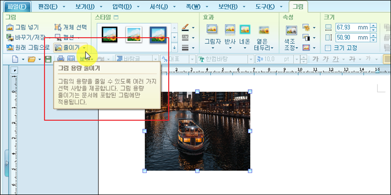 이번에는 사진 파일을 마우스로 클릭한 상태에서 한글 프로그램의 메뉴에서 "그림"을 클릭한 후 "줄이기" 버튼을 누릅니다. 해당 기능을 간단히 소개하자면 그림의 용량을 줄일 수 있도록 도와준다고 합니다. 그림 용량 줄이기를 할 수 있다고 표시되어 있네요.