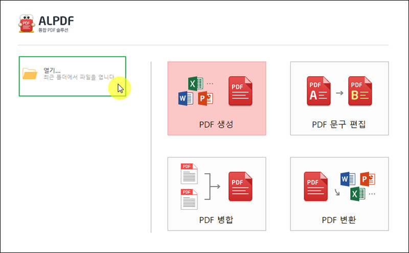 알pdf 프로그램을 설치 완료한 이후 실행해 보았어요. 이렇게 시작 화면이 나타나는데요. 여기에서 열기 버튼을 누른 후 한글파일로 변환을 하고 싶은 파일을 선택해 주세요. 참고로 시작 화면에서 볼 수 있듯이 pdf에 대한 생성, 문구 편집, 병합, 변환 기능을 갖추고 있는 프로그램이에요.