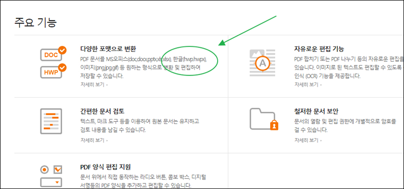 주요 기능을 잠깐 살펴볼게요. 알pdf 프로그램을 이용하여 pdf파일을 한글파일로 변환할 수 있다고 나와 있어요. 여기에 더하여 자유로운 편집, 철저한 문서 보안, 간편한 문서 검토 등의 기능을 제공한다고 하네요.