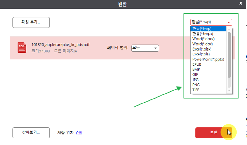 좌측 하단에 있는 찾아보기 버튼을 클릭해서 변환이 완료된 한글파일을 저장할 위치를 지정해 주세요. 마지막으로 "변환" 버튼을 클릭하면 원하는 포맷의 문서를 얻을 수 있어요.