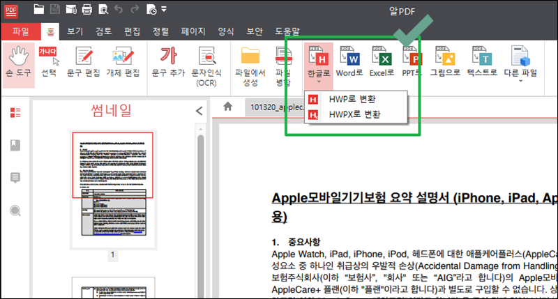 파일을 연 상태에서 프로그램 메뉴에 있는 "홈"을 클릭해 보세요. 그럼 메뉴 중앙에 "한글로" 아이콘이 보일 거에요. 해당 아이콘을 클릭하면 2가지 하위 메뉴가 나타나는데요. 아래아 한글 문서의 확장자를 의미하는 hwp와 hwpx로 변환하는 버튼이에요.