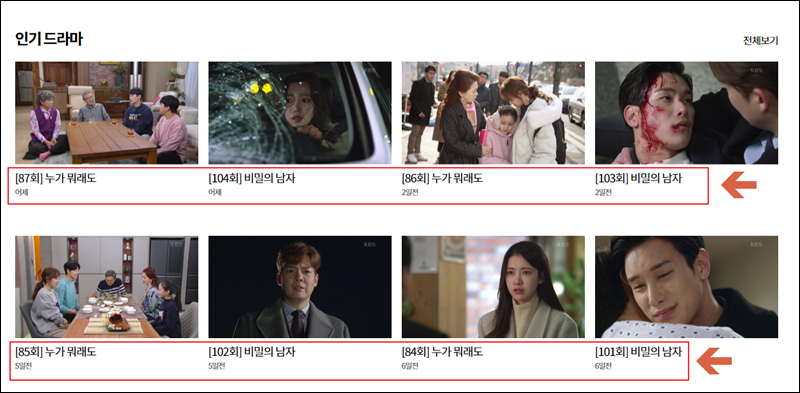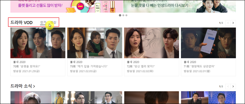 최근에 방영하고 있는 인기 드라마에 대한 다시보기 서비스도 제공하고 있는데요. 한 회만 제공하는 것이 아닌 처음부터 최근 방영분까지 해당 사이트를 통해 무료로 감상할 수 있어요.