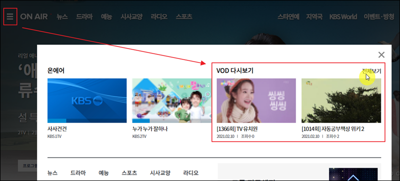 kbs 사이트에 접속했어요. 메뉴에서 가장 왼쪽에 위치한 아이콘을 클릭해 보세요. 그럼 온에어와 VOD 다시보기 서비스가 나타나는데요. 여기에서 전체보기를 클릭해 주세요.