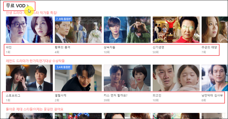 무료 VOD 페이지를 열어보세요. 과거에 인기가 많았던 싸인, 황후의 품격, 신기생뎐, 주군의 태양, 상속자들, 열혈사제, 스토브리그, 피고인, 낭만닥터 김사부 등을 감상할 수 있어요.