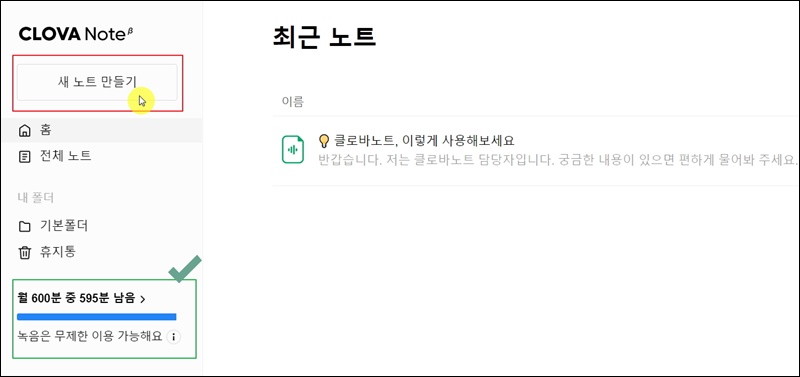 클로바노트의 음성파일에 대한 텍스트 변환 기능을 사용해 볼게요. 일단 해당 서비스를 사용하기 이전에 몇 가지 알고 있어야 할 점이 있는데요. 첫 번째는 텍스트 변환을 할 수 있는 음성파일의 시간이 정해져 있다는 것이에요. 월 600분까지 변환이 가능해요. 그리고 가장 먼저 노트를 만들어야 해요. "새 노트 만들기"를 클릭해 보세요.