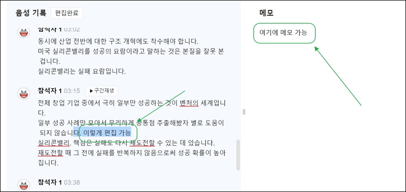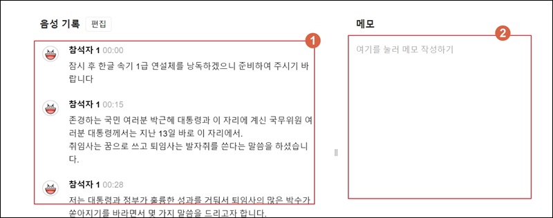 음성파일을 업로드하면 이렇게 텍스트로 변환된 결과를 얻을 수 있어요. 음성 기록 부분을 통해 텍스트 확인이 가능한데요. 우측에 있는 메모 영역을 통해 각 부분에 대한 코멘트를 남길 수 있게 되어 있어요.