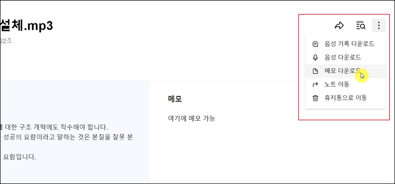 마지막으로 우리가 한 작업에 관련된 파일들을 다운로드 받을 수 있는데요. 음성 기록, 음성, 메모 이렇게 3가지 방식으로 다운로드 받을 수 있어요.