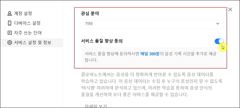 저와 다르게 매달 600분이 아닌 300분의 음성 기록 시간을 제공 받은 경우에는 서비스 품질 향상 동의를 체크해 주세요. 그럼 텍스트 변환을 할 수 있는 음성파일의 길이를 월 300분 추가할 수 있어요.