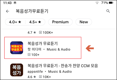 여러 가지 관련 어플이 나타났는데요. 여기에서 핫 미디어의 "복음성가 무료듣기"를 선택해 볼게요. 어플 선택 시에는 가급적 평점이 높고, 다운로드 횟수가 많은 것을 선택하는 것이 좋아요.