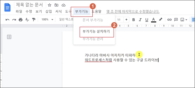 가장 많이 사용하는 구글 문서를 실행해 보았어요. 아래아 한글이나 마이크로오피스 워드처럼 사용할 수 있는 워드프로세서 프로그램이 나타났는데요. 문서 작성하기에 부족함이 전혀 없어요. 여기에 더하여 강력한 부가기능을 많이 제공하고 있는데요. 사용방법은 간단해요. 메뉴에서 "부가기능"을 클릭한 후 나온 하위 메뉴에서 설치 버튼을 누르면 돼요.