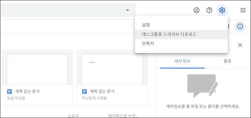 사이트에 접속하지 않고, 사용하고 있는 컴퓨터의 파일을 업로드 하는 방법을 알려드릴게요. 구글 드라이브 사이트에서 우측 상단에 있는 톱니바퀴를 클릭해 보세요. 그럼 3가지 메뉴가 나타나는데요. 여기에서 두 번째에 있는 "데스크톱용 드라이브 다운로드"를 클릭해 설치해 주세요. 그 다음부터는 안내에 따라 설치를 진행하면 내 컴퓨터에 있는 폴더를 쉽게 동기화할 수 있어요. 안내에 따라 진행하면 되기 때문에 데스크톱용 드라이브에 대한 자세한 사용방법은 생략하도록 할게요.