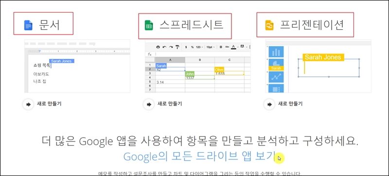 구글 드라이브 사이트에 접속해서 사용방법을 자세히 알려드릴게요. 일단 해당 사이트 메인화면을 보면 간단한 소개가 나오는데요. 해당 프로그램의 경우 인터넷 저장소 뿐만 아니라 문서, 스프레드시트, 프리젠테이션 작성을 위해서도 사용이 되고 있어요. 구글 드라이브를 통해 이용할 수 있는 오피스 프로그램의 경우 사용방법이 간단하고, 성능도 뛰어나 이용하는 사람이 많아요. 그럼 메인화면에 있는 "Google의 모든 드라이브 앱 보기"를 눌러 사용방법을 좀 더 자세히 설명해 드릴게요.