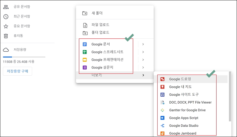 또 다른 구글 드라이브 사용방법을 알려드릴게요. 바로 구글의 문서, 스프레드시트, 프레젠테이션, 설문지, 드로잉, 내 지도, 사이트 도구 등의 기능을 사용하는 것인데요. 화면에 마우스 우클릭을 하면 각 프로그램을 쉽게 실행할 수 있도록 나와 있어요.