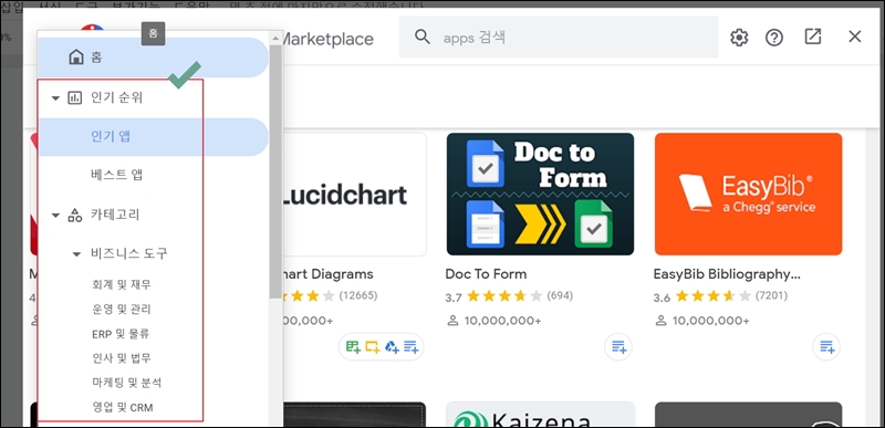 새롭게 창이 하나 열리는데요. 여기에서 설치할 수 있는 구글 드라이브의 부가기능이 굉장히 많이 나와요. 각 분야에 따라 전문적으로 사용할 수 있는 부가기능을 찾아보세요.