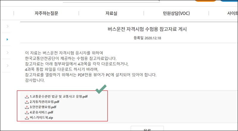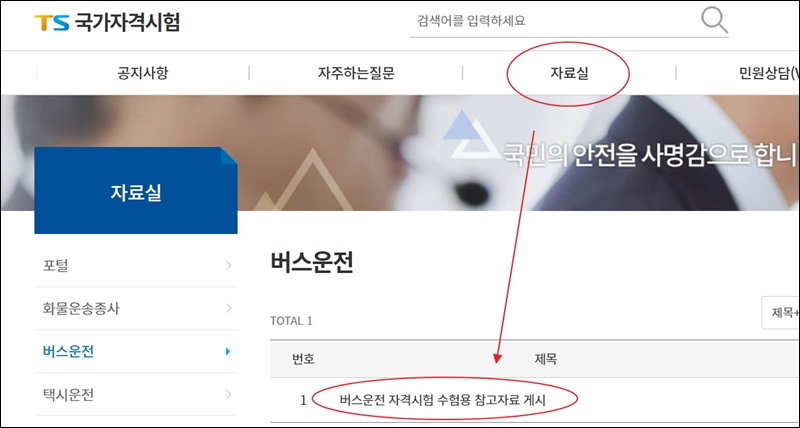새롭게 이동한 페이지에서 메뉴를 살펴보아 주세요. 공지사항, 자주하는 질문, 자료실, 민원상담이 있는데요. 여기에서 자료실을 클릭하면 버스운송자격증 수험용 참고자료 게시물이 나타나요. 해당 게시물을 클릭해 주세요.