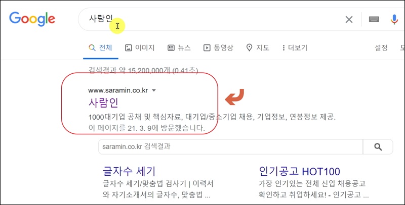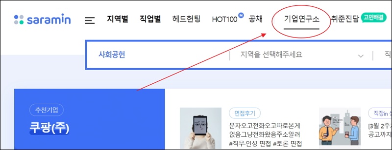 사람인 사이트에 접속했어요. 홈페이지에서 상단을 보면 메뉴가 여러 개 있는데요. 여기에서 기업연구소를 찾아 클릭해 주세요.