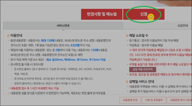 새롭게 열린 페이지를 보면 내용증명서 발송에 관련된 여러 가지 설명이 나와 있어요. 서비스와 요금에 대하여 자세하게 적혀 있는데요. 화면 상단에 있는 신청 버튼을 누르고, 앞서 찾은 전세금 반환 샘플을 참고하여 작성하면 돼요.