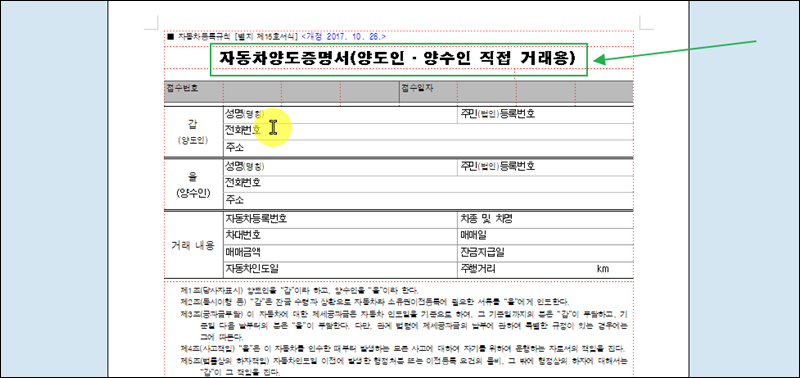 보통 개인끼리 직접 중고 자동차를 거래할 때에는 양도증명서를 작성해요. 해당 증명서가 매매계약서라고 할 수 있는데요. 이 밖에도 준비해야 하는 서류가 몇 가지 있어요. 일단 해당 매매계약서를 살펴보면 빈 칸을 채워 넣기만 하면 되기 때문에 작성하기 편하고요. 중고차량에 대한 거래를 할 때 참고해야 할 사항이 모두 적혀 있어요.