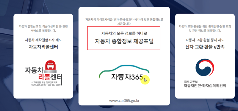 사이트에 접속하면 리콜센터, 자동차안전 및 하자심의위원회, 자동차368가 나오는데요. 중앙에 있는 사이트를 선택하면 개인 자동차 매매계약서 양식을 다운 받을 수 있는 사이트로 이동할 수 있어요.