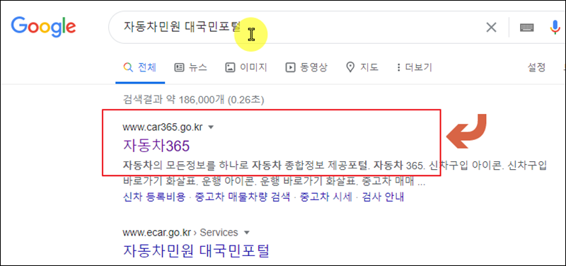 사이트에 접속하면 맨 위에 "자동차민원 대국민포털" 바로가기 버튼이 있는데요. 해당 버튼을 클릭해 주세요.