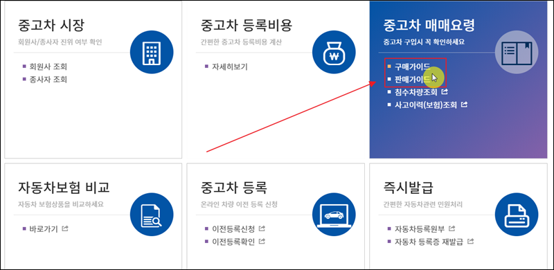 중고차 시장, 중고차 등록비용, 중고차 매매요령, 중고차 등록, 자동차 등록원부 또는 등록증 재발급 등의 서비스 메뉴가 나타나는데요. 여기에서 구매가이드와 판매가이드를 참고하면 좋아요. 개인끼리 자동차를 거래할 때 도움이 되는 내용이 있어요.