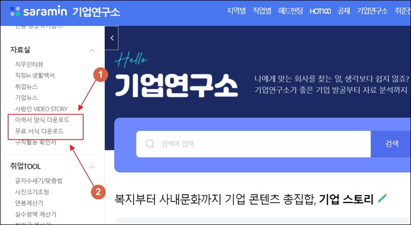기업연구소 페이지가 열렸어요. 이곳에서는 일자리에 관련된 여러 가지 자료를 제공하고 있는데요. 좌측에 있는 자료실 카테고리를 보면 직무인터뷰, 직장인 생활백서, 취업뉴스, 기업뉴스 등이 보일 거에요. 해당 카테고리에는 우리가 찾는 게시판도 포함이 되어 있어요. 자기소개서 양식의 경우에는 "무료 서식 다운로드"를 클릭하면 나와요.