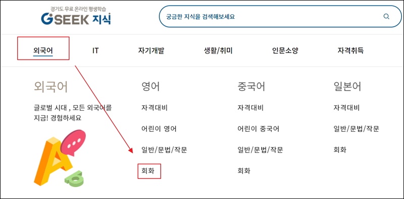경기도 지식 사이트에 접속했어요. 영어회화는 물론이고, 중국어나 일본어에 대한 여러 가지 강의도 마련되어 있어요. 더 나아가 IT, 자기개발, 생활, 취미, 인문소양, 자격취득에 관련된 온라인 학습 컨텐츠로 제공하고 있으니 배우고 싶은 것이 있다면 잘 활용해 보세요.