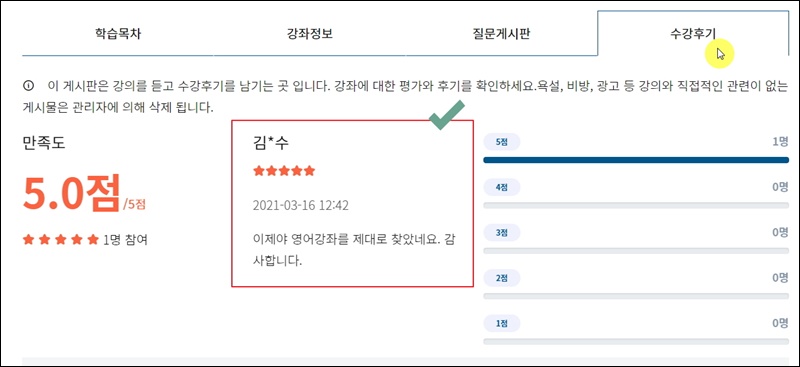 워낙 다양한 강의를 제공하는 곳이기 때문에 어떤 강의를 선택해야 할지 모를 수 있는데요. 이럴 때에는 수강후기를 한 번 살펴보세요. 그럼 만족도와 후기 내용을 참고할 수 있어요.