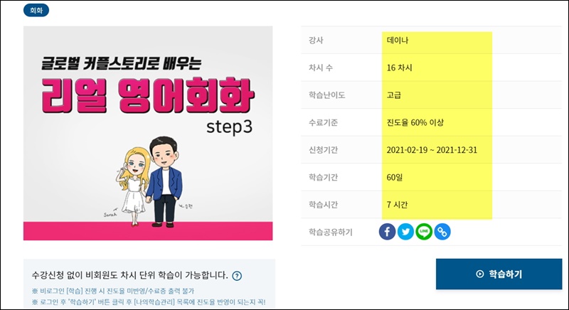 하나의 강좌는 여러 개의 강의로 구성되어 있어요. 제가 선택한 리얼 영어회화의 경우 16차시로 구성되어 있고요. 난이도는 고급이네요. 자신의 영어회화 실력이 부족하다고 판단된다면 난이도가 초보 또는 기본으로 되어 있는 것을 선택해 주세요. 학습시간은 7시간이고요. 학습기간은 60일이네요. 충분한 기간 동안 영어회화를 공부할 수 있어요.