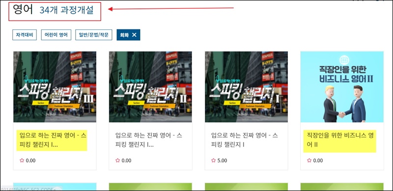 이곳에서 제공하고 있는 영어회화에 관련된 온라인 강좌가 34개나 돼요. 직장인을 위한 비즈니스 영어회화 강의도 있으니 참고해 주세요.