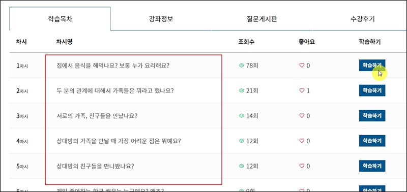 경기도 지식 사이트에서 이용할 수 있는 온라인 강의의 경우 원하는 차시부터 공부할 수 있어요. 목차를 보면 모든 차시에 대하여 무엇을 배우는지 나타나 있는데요. 여기에서 "학습하기"를 클릭하면 해당 차시에 대한 학습 영상을 볼 수 있어요.